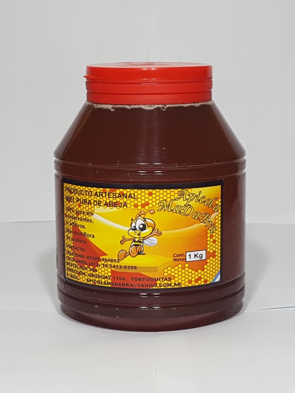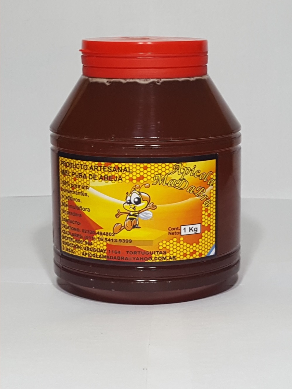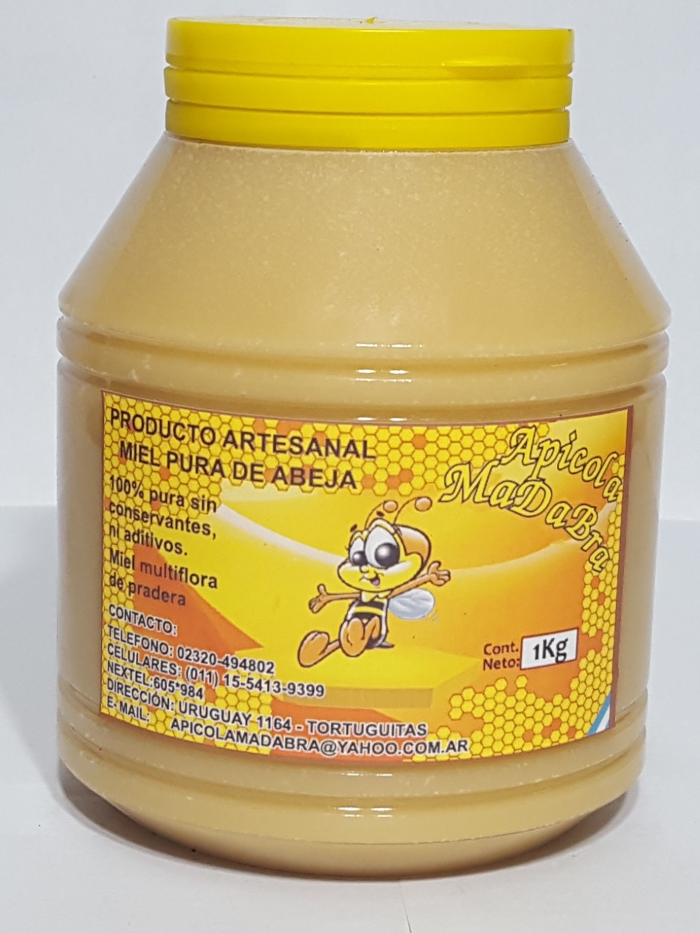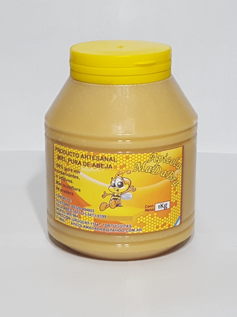 Envase de 1Kg de Miel 100% pura de abejas sin conservantes ni aditivos.